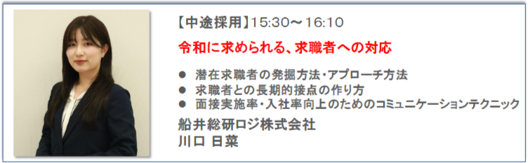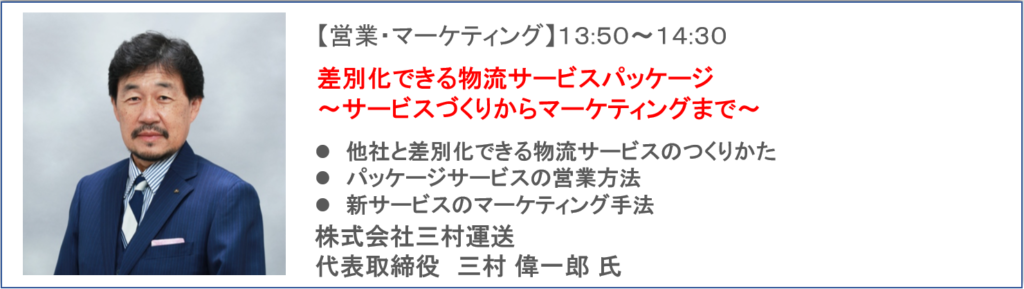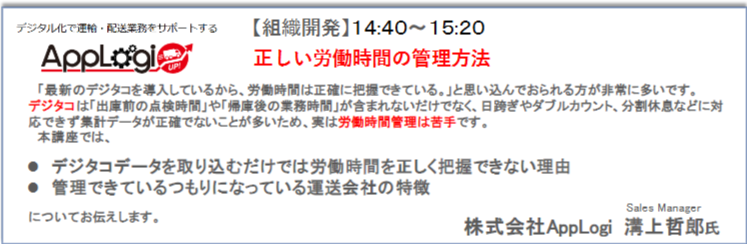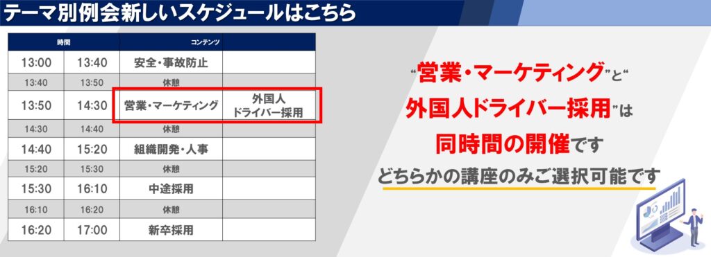 「安全・事故防止」・「営業・マーケティング」・「外国人ドライバー採用」・「人事労務・組織開発」・「中途採用」・「新卒採用」の6つのテーマにて講演がございます。