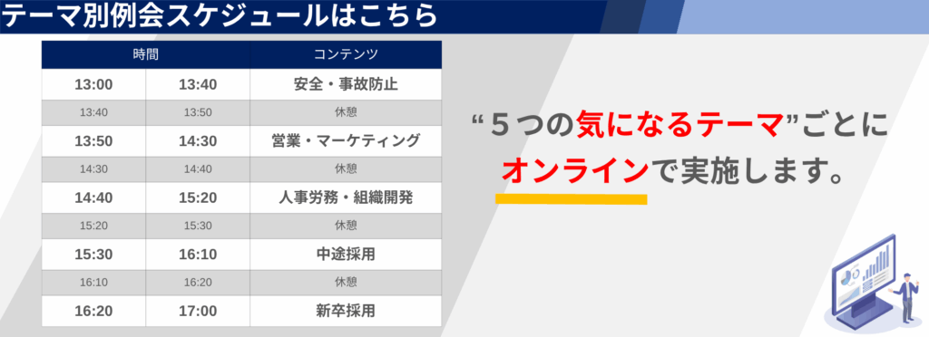 安全・事故防止」・「営業・マーケティング」・「人事労務・組織開発」・「中途採用」・「新卒採用」の5つのテーマにて講演がございます。